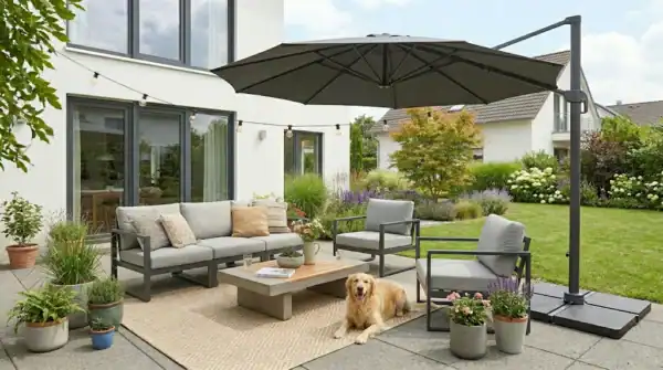 Wohnen unter freiem Himmel – Musthave: ein Outdoor-Teppich. Foto: Das Wohnmagazin | Visual erstellt mit KI-Unterstützung
